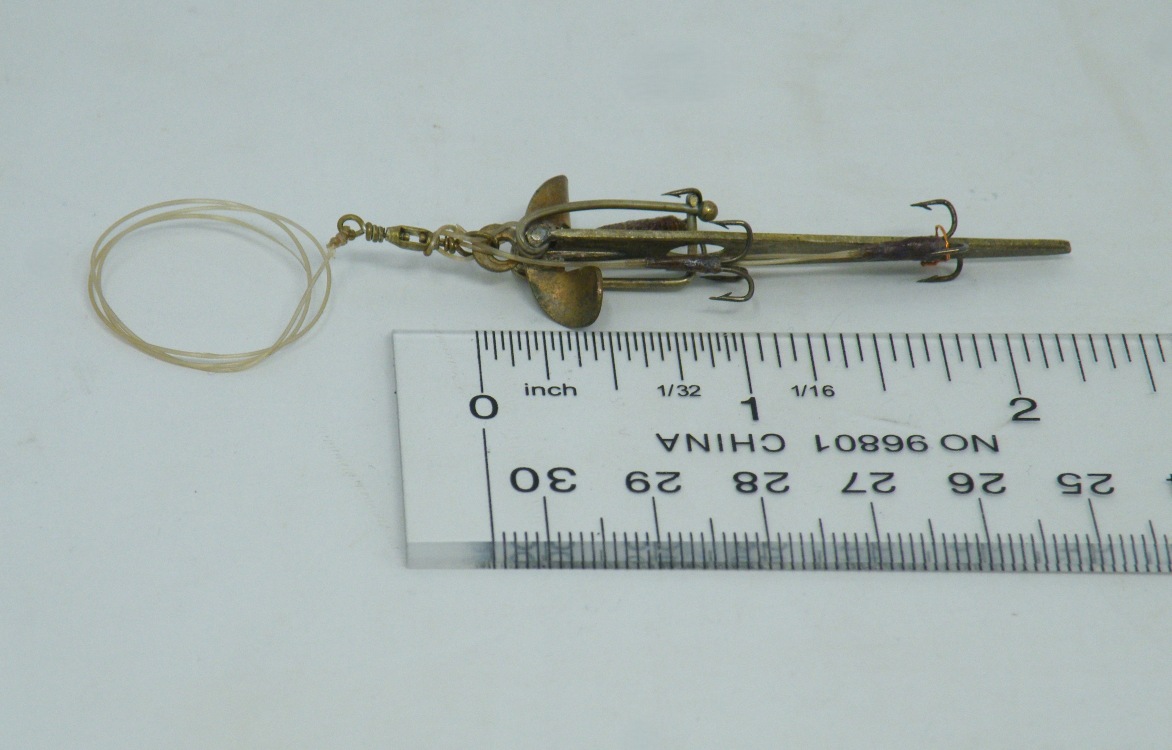 Unknown Maker – 2 post 1910 ”Archer Spinners” (tiny – 1.5” each NOT incl. brass barrel swivels) – Both ”Archers” UNMARKED but blades clearly mimic Milward’s 1910 Patent – 1 ”Archer” rigged with 3 treble hooks & hooks missing on other -1bb
