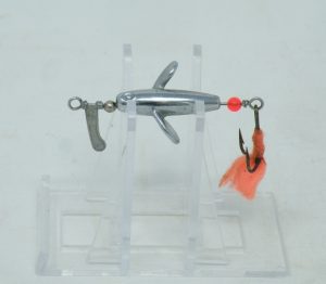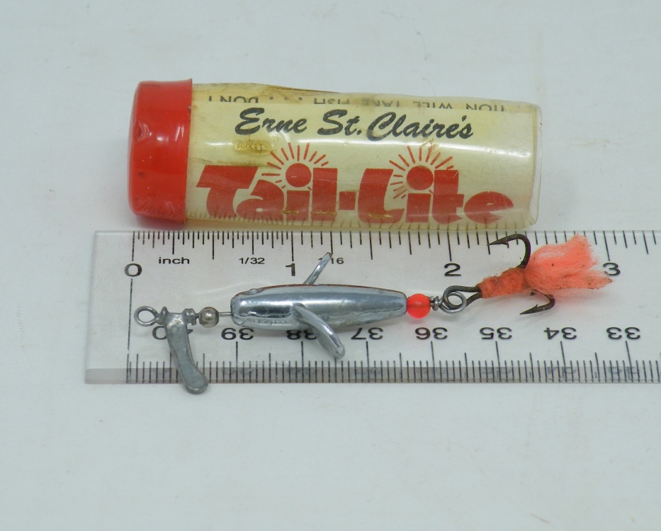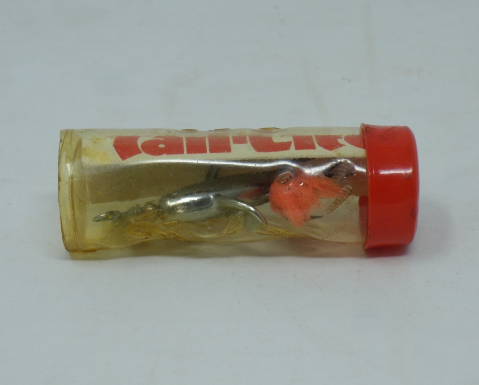 Devon Minnow – Erne St.Claire – c.1954 ‘Tail-Lite Devon’ (1.063” body) in original tube with correct paper – silver body & orange tail dressing -1aa