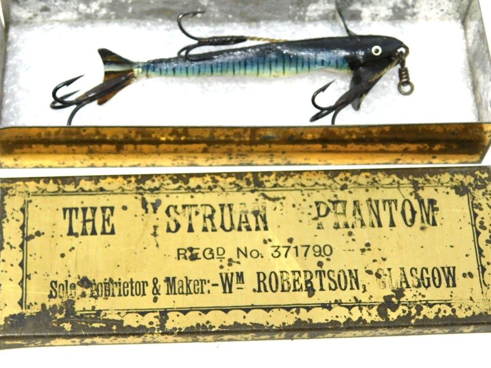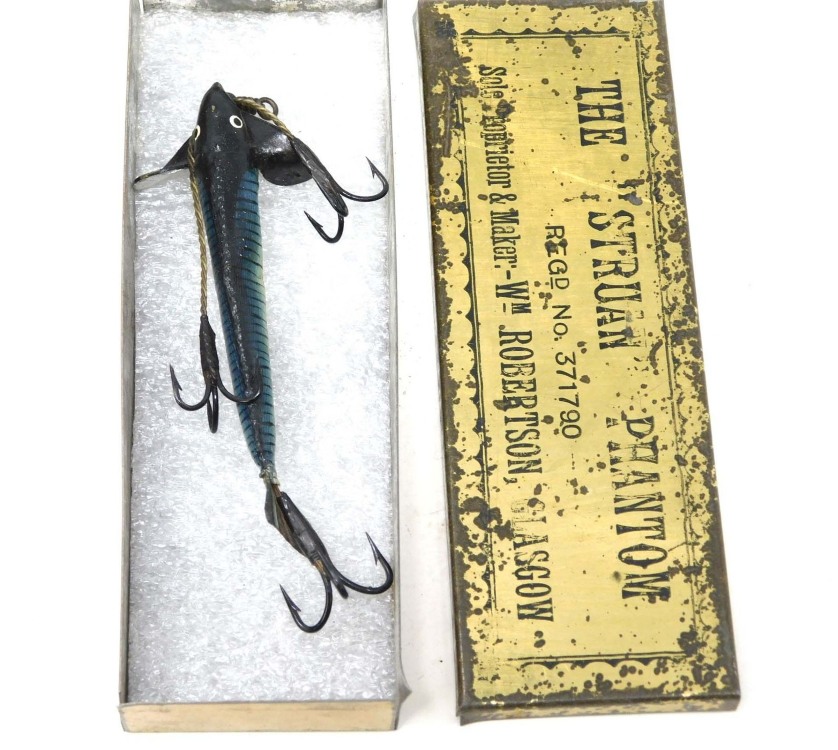 “Vintage Phantom Minnows” from my Vintage Fishing Collections (please excuse any ‘camera glare’ on some of the photos). The “Phantom Minnow” was invented by iconic Scottish tackle maker William Brown c.1840’s & quickly became a staple item in the tackle box of United Kingdom anglers. Its popularity spanned the British Isles, as well as parts of Europe, Canada & USA, and continued for about 100 years). …… These often colourful minnow imitations usually had 3 treble hooks (a tail treble & 2 ”flying” trebles), but sometimes just one or two, and had bodies made of various materials, including silk, fish skin, waterproofed cloth, horsehair, quill, metal, cork, celluloid & leather (to name a few). Phantom Minnows were designed to spin (thus the curved ‘blades’ attached to the head) & the resulting line twist was a common problem. From the mid-1890’s to roughly the early 1900’s, the ”mouths” of Phantom Minnows were commonly fitted with ”GEEN’s PATENT SWIVEL” to reduce the line twist problem).